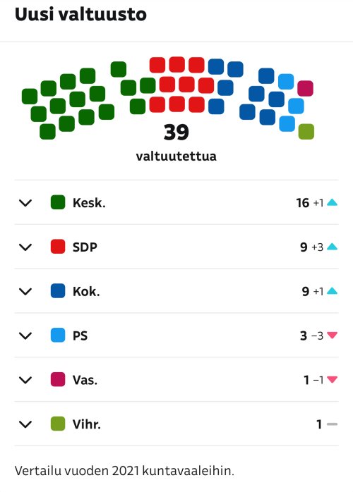 Keskusta jatkaa valtuuston suurimpana ryhmittymänä 16 paikalla. SDP ja Kokoomus ovat toiseksi suurimpia 9 paikalla, SDP:n saatua vaaleissa 3 lisäpaikkaa. Keskusta ja Kokoomus saivat molemmat 1 lisäpaikan. Perussuomalaisilla on jatkossa 3 menetetyn paikan myötä 3 valtuutettua. Vasemmistoliitto menetti toisen valtuustopaikkansa. Myös Vihreä liitto jatkaa yhden valtuutetun voimin.